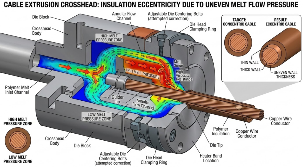 Let’s talk about what actually happens inside the barrel. Insulation eccentricity occurs when the copper or aluminum conductor is pushed off-center inside the polymer matrix. Operators will tweak the die head to compensate, but if the issue is dynamic—meaning the thin spot moves around the circumference of the cable or pulses down the length of the wire—tooling adjustments are useless.