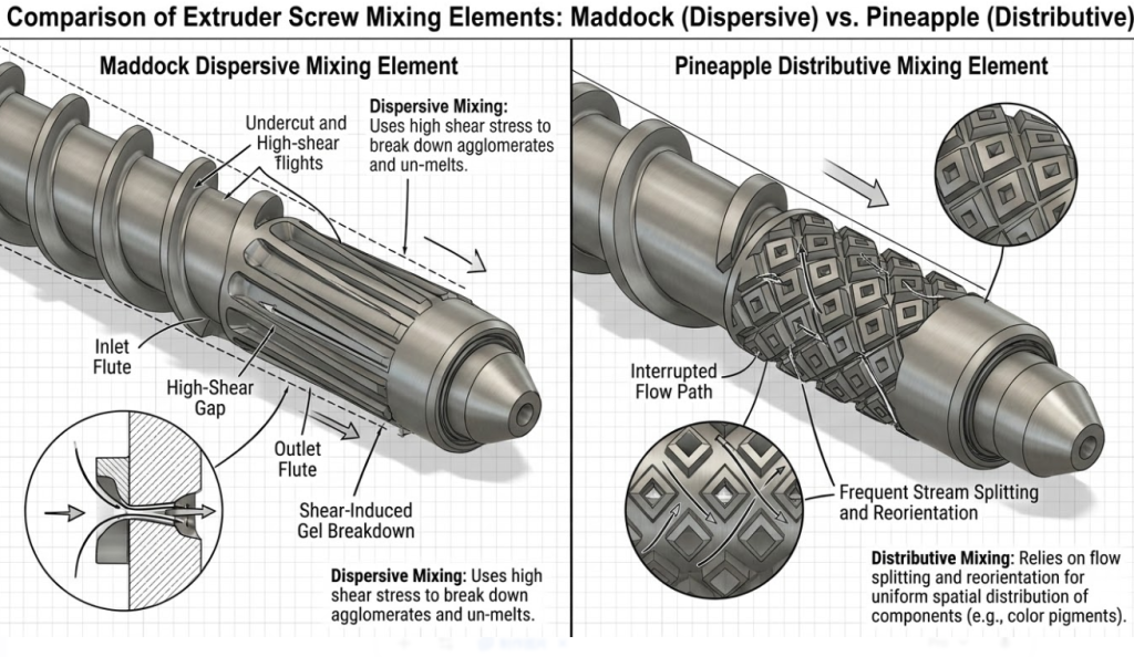 In extrusion, we look at two types of mixing: dispersive and distributive. Dispersive mixing elements (like a Maddock mixer) force the melt through tight clearances under high shear stress. This physically breaks down agglomerates, un-melted resins, and color masterbatches. Distributive mixing elements (like a Pineapple mixer) slice and fold the melt without high shear, evening out the temperature gradients. If you are struggling with color streaks or thermal variations that cause the wire to drift off-center, your mixing geometry is wrong. At BLOOM, we often machine hybrid mixing heads to deliver a melt that is both compositionally mixed and thermally balanced.
