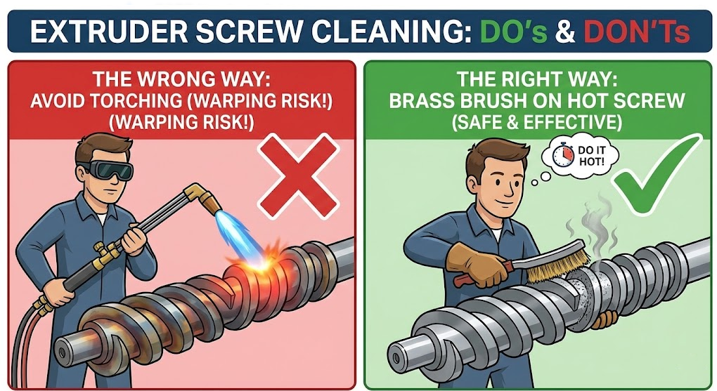 In many older plants, the moment an operator sees hardened plastic stuck to a screw flight, they grab an acetylene torch and start blasting it. Stop them immediately.