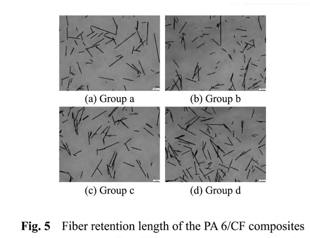 Statistical distribution of the fiber retention length showed that Groups a, c, and d followed a normal distribution between 0~600 μm, with peak values concentrated between 100~300 μm. The 90° kneading block (Group c) and slotted screw (Group d) did not provide stronger shear stress than the 45° kneading block (Group a). Instead, they utilized the extended residence time to thoroughly shear the remaining long fibers, resulting in a more concentrated length distribution that also favors dispersion and mixing within the melt.