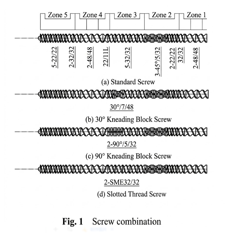 The experiment utilized a co-rotating twin-screw extruder with a conventional reinforcing screw layout.