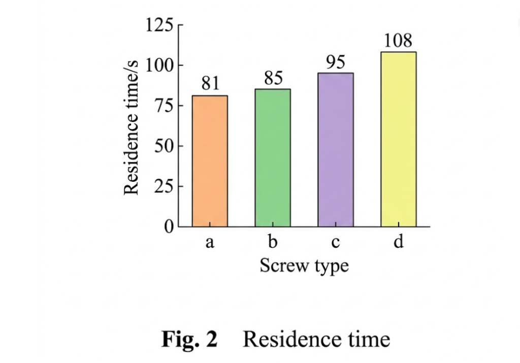 This occurs because the stagger angle of the kneading blocks causes material exchange between adjacent kneading discs. The larger the stagger angle (e.g., 90° vs. 30°), the larger the gap between adjacent discs, resulting in more severe backflow, decreased conveying capacity, and increased residence time (the 90° block added 10 seconds compared to the 30° block). The slotted screw achieved the best extension of residence time because its unique groove structure generates more backflow than the gaps in kneading discs.